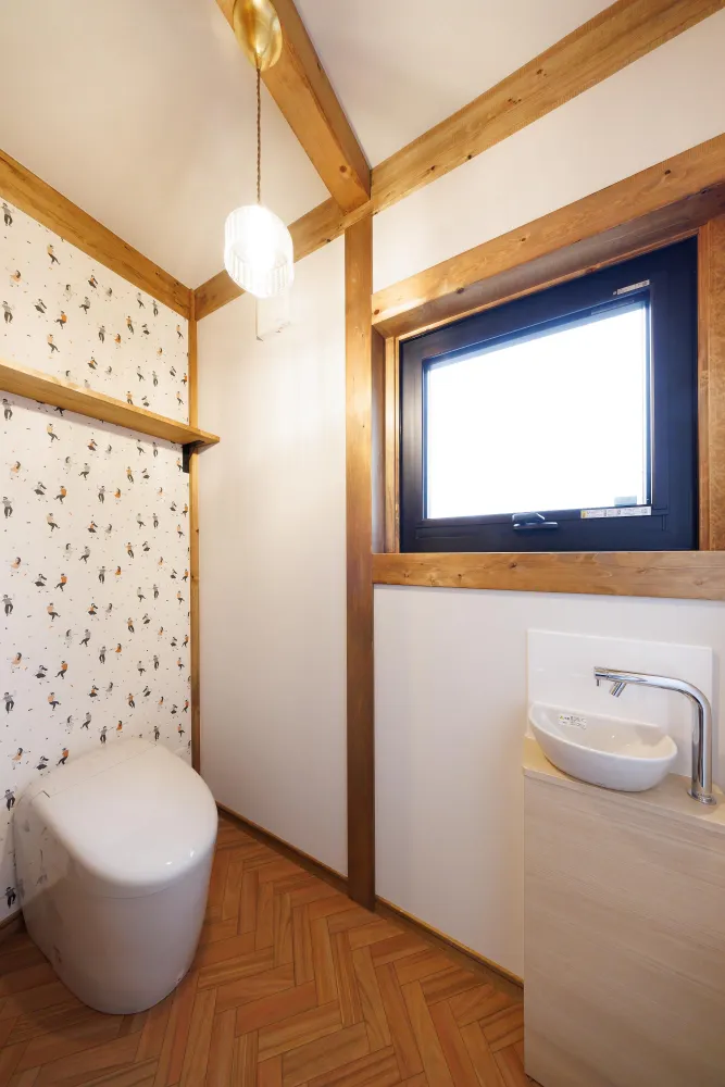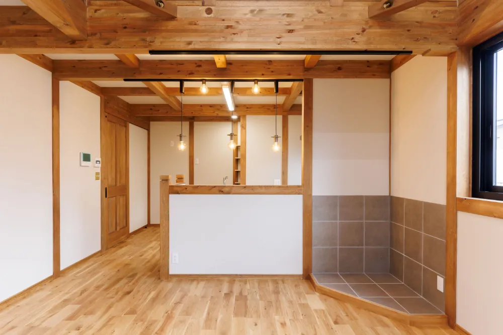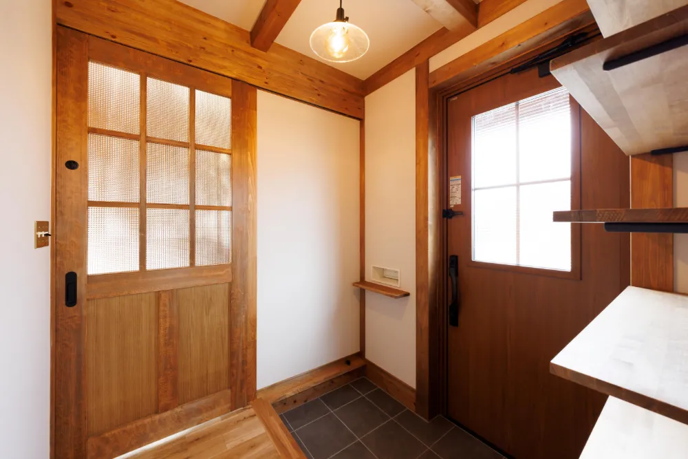 チェッカーガラスを使用したドアにクラシックなスイッチに無垢の床、真壁づくりと見た目はどこか懐かしさを感じるレトロな雰囲気・・・だけどZEH仕様で冬暖かく夏涼しい、水回りは機能的な設備を取り入れた木のあたたかみのあるレトロかわいいお家です。