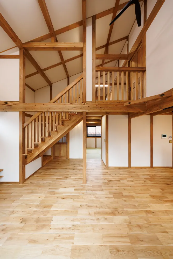 勾配天井で高いリビング・ダイニングは20帖よりも広く見せます。リビングに隣接されたタタミコーナーはセミオープンでお子さんのお昼寝や来客時にと用途がたくさんです。
