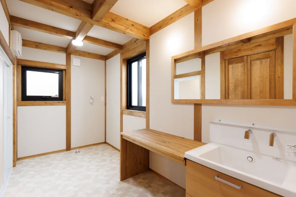 キッチン⇔洗面脱衣室の同線も短く、洗面脱衣室はウォークインクローゼットが隣接されているので洗濯物をすぐウォークインクローゼットにしまえます。